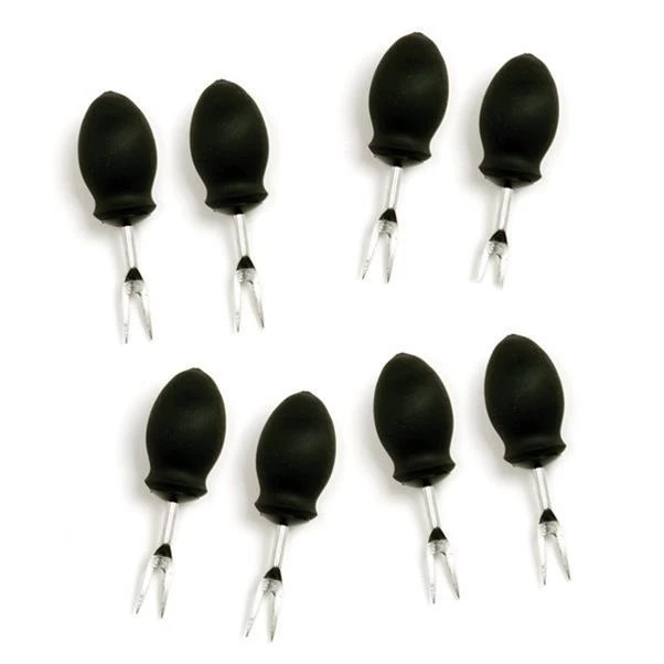 8 deluxe corn holders with non-slip, heat resistant, comfort grip santoprene handles with stainless steel prongs.